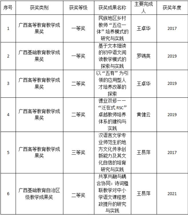 中国现当代文学学科是自治区重点学科;中国语言文学是学校重点建设学科,承担学科教育(语文)硕士点建设任务;汉语言文学专业是国家级一流本科专业建设点,同时也是自治区一流专业;“汉语言文学专业教学团队”是自治区级教学团队;中国现当代文学教学团队获得“广西区重点教学团队”称号;汉语国际教育专业被列为广西区高等学校优势特色专业建设项目;《古代汉语》和《中国古代文学》获自治区一流立项建设课程;《中国现当代文学》《教师口语艺术》是自治区级精品课程,另有10多门课程分别获得学校的地方特色课程、精品课程、优质课程立项。近年来,学院还整合优势资源,承担国家级项目14项(含重大项目1项),省部级项目16项,其他各级各类科研项目200多项、教研项目60多项,出版专著(合著)50多部,发表各级各类论文200余篇,获得自治区教学成果奖6项、自治区社科成果奖8项、广西高校艺术教育论文奖3项。举办问津学术沙龙、博雅大讲坛及其他学术活动上百场次。